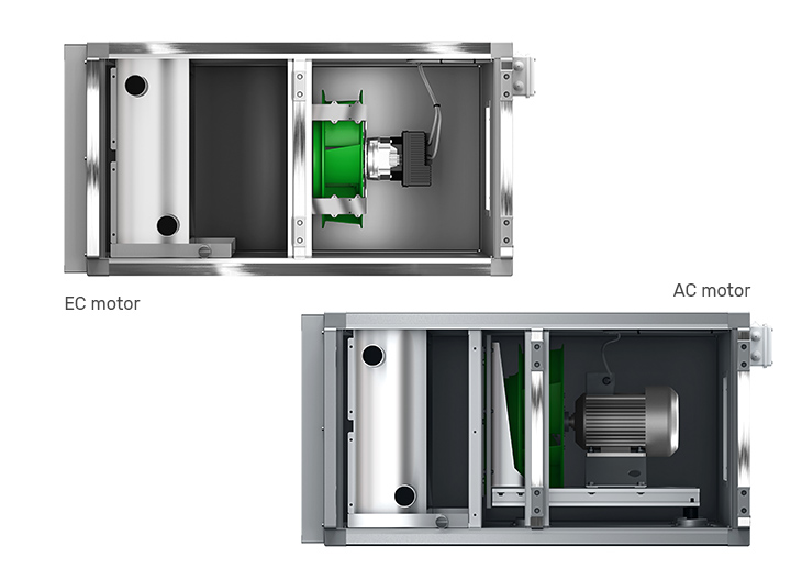هواساز های VENTUS S-type مجهز به فن های از نوع PLUG به صورت Direct Drive هستند. فن های بکار برده شده در دستگاه های سری جدید SVS دارای موتور های AC و EC هستند. موتور های استاندارد AC مطابق با استاندارد عایق و سیم پیچی کلاس F تولید می شوند که باعث عملکرد بدون نقص آنها هنگام استفاده از VFD  می شود. موتورهای EC از نوع موتور های آهنربای دائمی (PM) هستند که متفاوت از موتور های  AC که عمدتأ نیازمند انرژی زیادی برای روشن شدن و کار در دور بالا می باشند. موتور های EC نیازمند ولتاژ 0-10  یا سیگنال های کنترل MODBUS هستند.
